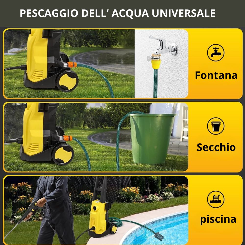 Puoi usarla se hai una rubinetto in giardino , ma anche se non lo possiedi, perchè grazie alla pompa di pescaggio può prelevare acqua da un semplice secchio o pozza di acqua o da una piscina