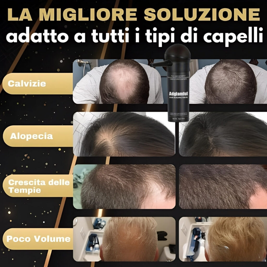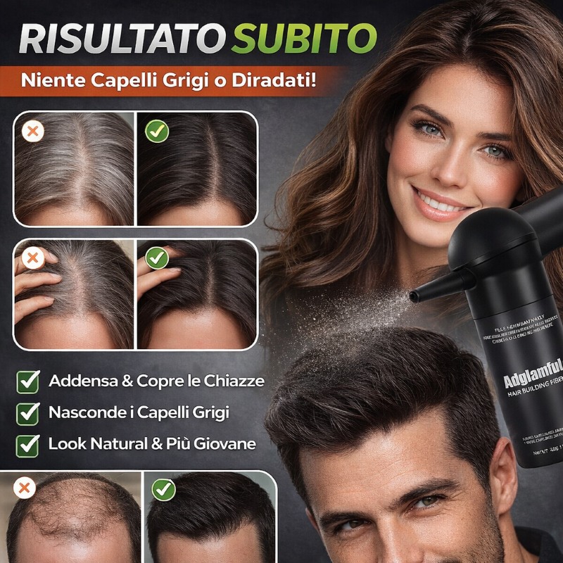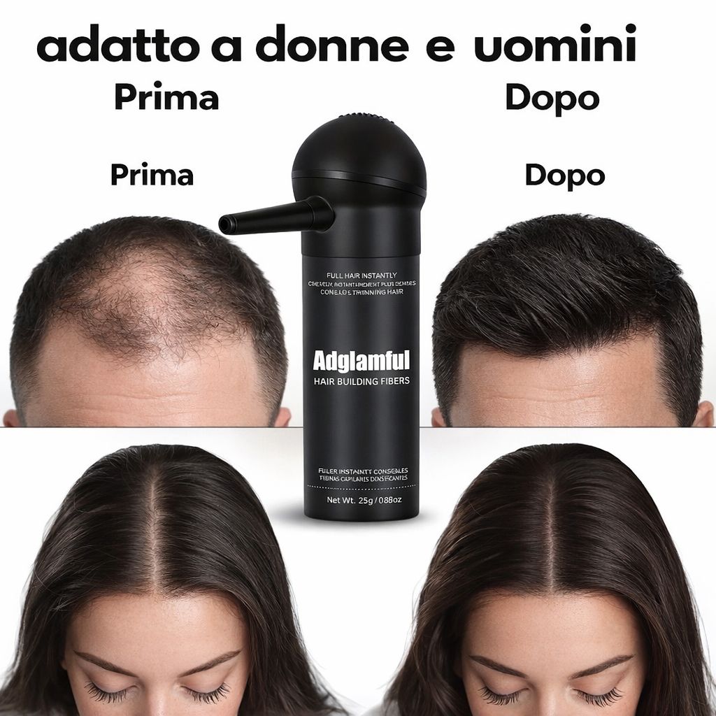 ti permette di risolvere rapidamente e facilmente i problemi di calvizie e alopecia , MA anche di chiazze dove mancano capelli. Con un’applicazione veloce, copre le aree diradate in modo naturale e discreto, donando un aspetto più pieno e voluminoso ai tuoi capelli. Non solo nasconde le imperfezioni, ma crea una texture liscia e leggera, che resiste anche alle condizioni atmosferiche più difficili. Ideale per chi cerca una soluzione pratica e immediata, questo prodotto è la risposta per avere capelli dall’aspetto sano e pieno, senza compromettere il comfort o la praticità.