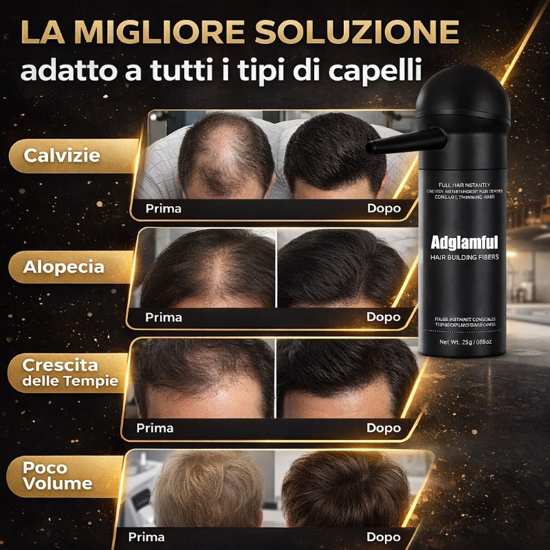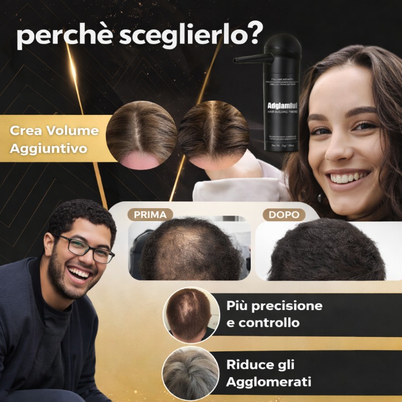 è il prodotto innovativo che ti permette di ottenere capelli dall’aspetto sano, voluminoso e luminoso, coprendo istantaneamente le zone di calvizie, alopecia o chiazze senza dover ricorrere a trattamenti invasivi. La formula avanzata, arricchita con idrolizzato di seta, oli di argan e lino, ti garantisce capelli morbidi, lucenti e protetti. Perfetto per chi desidera coprire le zone calve in modo rapido, senza rinunciare a un effetto naturale e duraturo